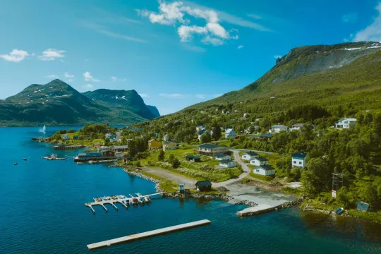 Senja Fjordcamp has five newly refurbished cabins with sea views. These two-bedroom cabins accommodate four guests and feature a fully equipped kitchen and modern bathroom with toilet and shower. Bed linen and towels are included. Adjacent to the cabins is a marina and sites for camper vans with electrical connection and access to fresh water and a waste station. The modern service building features a kitchenette and separate showers and toilets. The reception and restaurant are also located here.